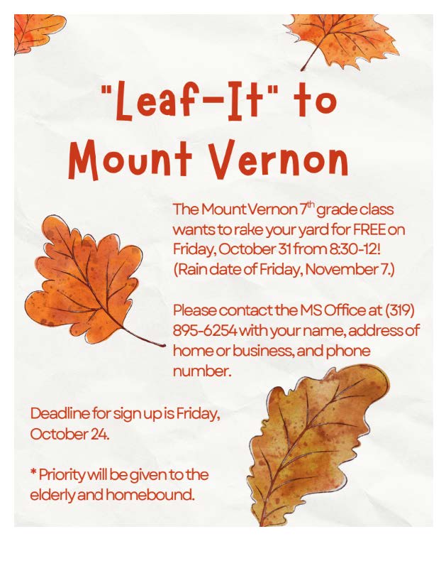 10/31- 7th Grade Leaf Raking project Priority will be given to the elderly and homebound. Do you know someone who lives in Mount Vernon and could use help with raking their yard? October 1, 2025 News Related News All News Aug 25 10/28 Picture Retakes School picture day at the MS was on Wednesday, September… Read more Nov 19 Attendance Just a reminder to always bring back a note from the… Read more Oct 25 School Lunch accounts Please keep a positive balance in your school lunch account. Read more