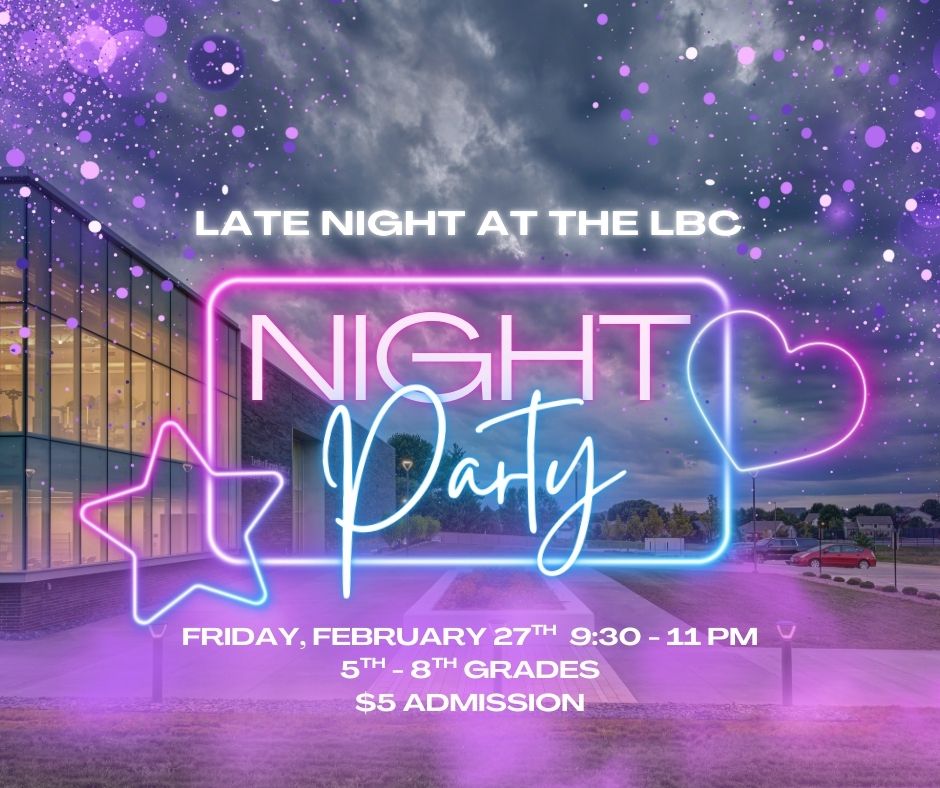Late Night at the LBC, Friday, February 27 at 9:30-11:00pm – Calling all middle schoolers, 5th-8th grade, this night is for you! Hang out with friends after hours at the LBC. Activities include basketball, volleyball, pickleball, I wall & t-wall, and rock climbing. Also, video games, 9 square in the air, group karaoke, glow laser tag and more. Pizza and concessions will be available for purchase. $5 admission for everyone regardless of membership.